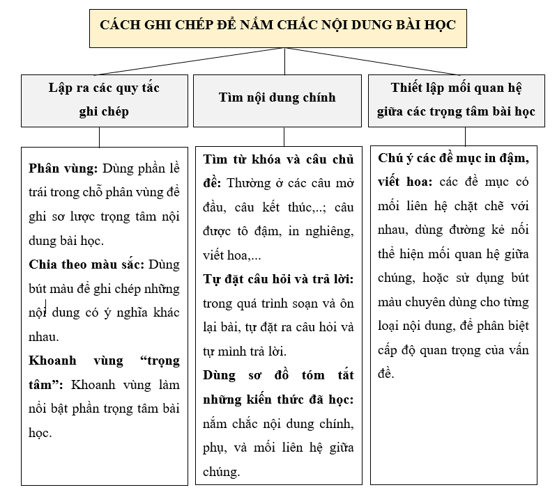 Tóm tắt nội dung của văn bản Cách ghi chép để nắm chắc nội dung bài học bằng sơ đồ tư duy.
