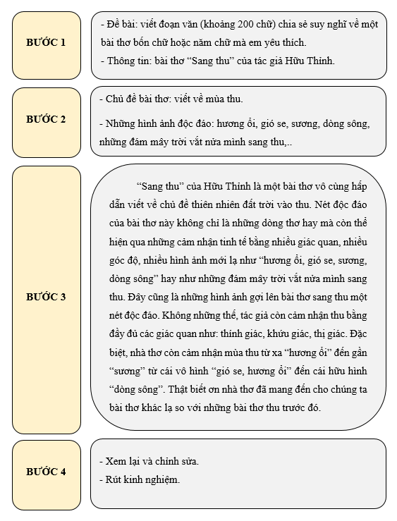 Thực hiện các bước trong quy trình để viết đoạn văn (khoảng 200 chữ) chia sẻ suy nghĩ về một bài thơ bốn chữ hoặc năm chữ mà em yêu thích.