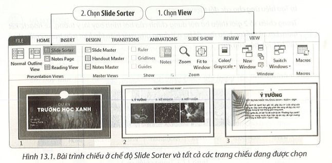 Bước 1. Chọn View/Slide Sorter để hiển thị các trang chiếu ở chế độ sắp xếp.