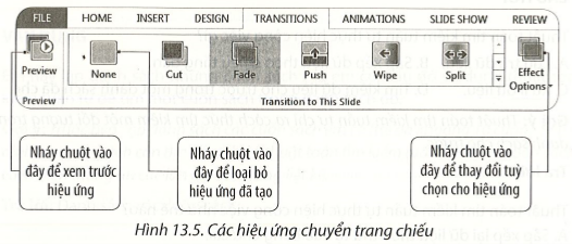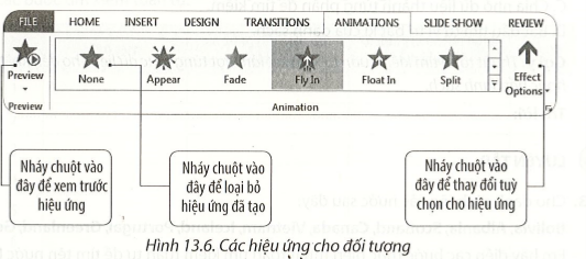 Lưu ý: Muốn thay đổi hiệu ứng em chỉ cần chọn lại hiệu ứng khác. Nếu muốn loại bỏ hiệu ứng đã tạo cho trang chiếu 2 cho đối tượng em cần chọn trang chiếu và đối tượng rồi chọn None trong nhóm Transition to this Slide hoặc nhóm Animation tương ứng.