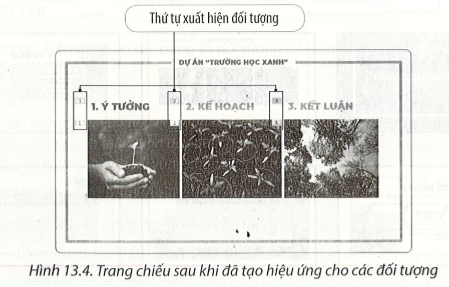 Em có thể thấy trong Hình 13.4, bên cạnh các đối tượng xuất hiện các ô vuông bao quanh các số 1, 2, 3. Các ô này cho em biết thứ tự xuất hiện của các đối tượng khi trình chiếu.