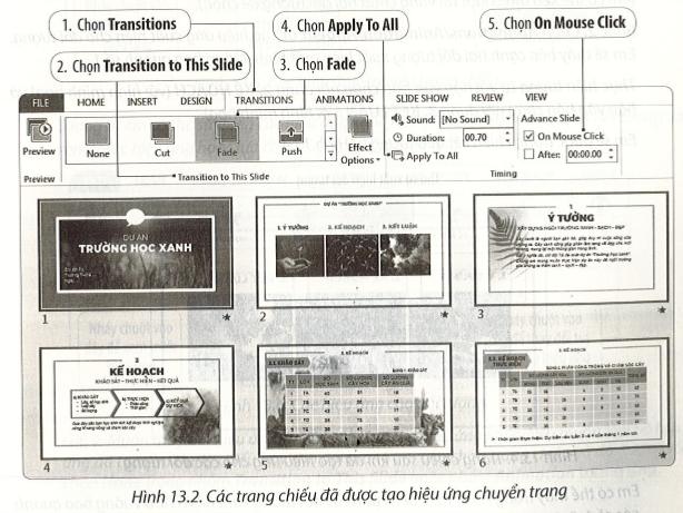 Bước 3. Chọn Transition/Transition to this Slide/Fade để chọn hiệu ứng chuyển trang Fade. Trong nhóm lệnh Timing chọn Apply to All để áp dụng hiệu ứng cho tất cả các trang và đánh dấu vào mục On Mouse Click để chọn chuyển trang khi nháy chuột.