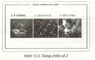 Trang chiếu số 2 giới thiệu ba nội dung chính của bài trình bày là: ý tưởng, kế hoạch, kết luận. Em có thể tạo hiệu ứng để ba nội dung này xuất hiện lần lượt trên trang chiếu theo thứ tự trình bày của em.