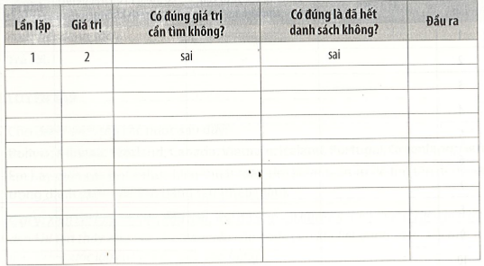 Gợi ý: Xem xét mục tiêu dữ liệu đầu tiên, sau đó xem xét lần lượt từng mục tiêu dữ liệu tiếp theo cho đến khi tìm thấy mục dữ liệu được yêu cầu hoặc đến khi hết danh sách. Với mỗi mục dữ liệu, điền bước lặp của thuật toán và bảng.