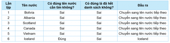 Em hãy điền các bước thực hiện thuật toán tìm kiếm tuần tự để tìm tên nước Iceland trong danh sách trên vào bảng sau (theo mẫu).