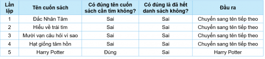 Gợi ý: Trước tiên, lập danh sách các cuốn sách em có (tối đa khoảng 10 cuốn). Sau đó xác định tên cuốn sách cần tìm. Thực hiện thuật toán tìm kiếm tuần tự để tìm cuốn sách bằng cách điền thông tin các lần lặp và bảng liệt kê.