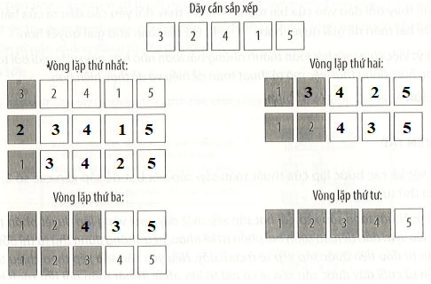 Luyện tập 16.4 trang 77 vở thực hành Tin lớp 7: Em hãy liệt kê các bước của thuật toán sắp xếp nổi bọt để sắp xếp các số 3, 2, 4, 1, 5, theo thứ tự tăng dần.