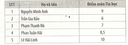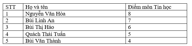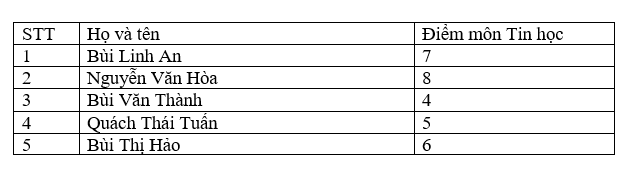 Hướng dẫn: Bảng điểm thường có dạng như bảng sau.