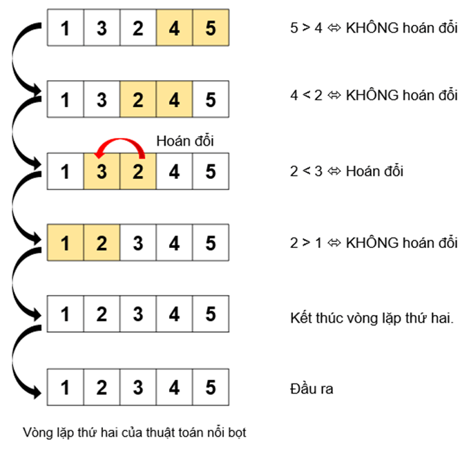 Vòng lặp thứ hai: Bạn Hải sẽ đổi chỗ cho bạn Nam. Kết thúc vòng lặp thứ hai thứ tự sắp xếp sẽ là Hoa, Nam, Hải, Tuyết, Hồng.