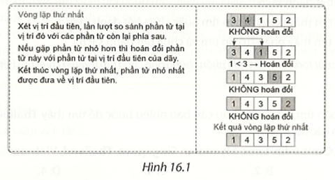 Gợi ý: Thuật toán sắp xếp chọn sắp xếp dãy theo thứ tự tăng dần sẽ lấy phần tử ở vị trí cần sắp xếp và so sánh với các phần tử còn lại chưa được sắp xếp nếu thấy phần tử nào nhỏ hơn thì đổi chỗ với phần tử ở vị trí cần sắp xếp. Mỗi vòng lặp duyệt từ phần tử ở vị trí cần sắp xếp đến cuối dãy, kết thúc vòng lặp tại vị trí cần sắp xếp sẽ là phần tử nhỏ nhất của dãy chưa sắp xếp. Khác với thuật toán nổi bọt là đổi vị trí của hai phần tử liền kề khi chúng không đúng thứ tự, thuật toán chọn so sánh phần tử ở vị trí sắp xếp với phần tử còn lại chưa sắp xếp và đổi chỗ nếu chúng không đúng thứ tự.
