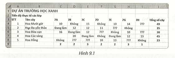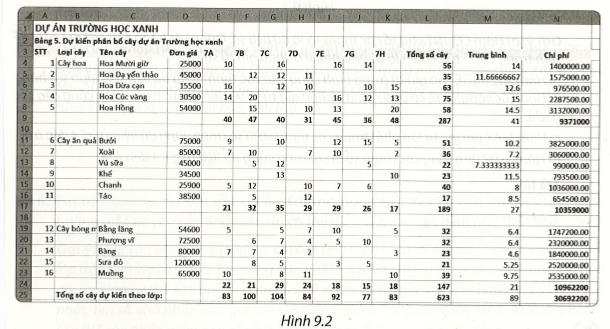 Vận dụng 9.4 trang 46 vở thực hành Tin lớp 7: Em hãy quan sát bảng Dự kiến phân bổ cây dự án Trường học xanh ở Hình 9.13 và hãy trả lời các câu hỏi sau: