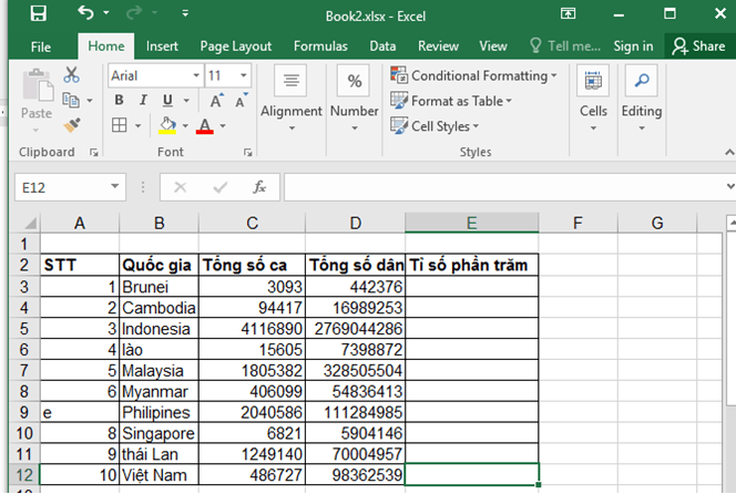 c) Để tính tỉ số phần trăm ta lấy số ca chia cho tổng số dân. Tại ô E3 ta gõ công thức: =C3/D3. Sau đó chọn cột E rồi nhấn nút ![]()