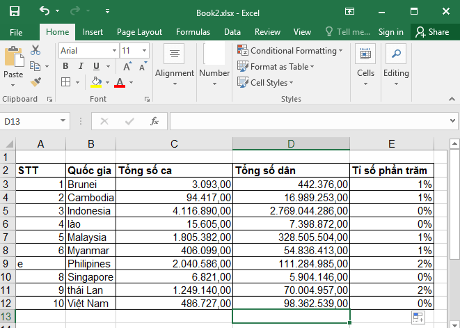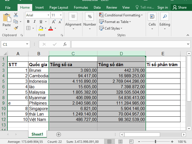 c) Tính tỉ số phần trăm tổng số ca nhiễm bệnh trên tổng số dân vào cột Tỉ số phần trăm cho các ô và định dạng cho phù hợp.