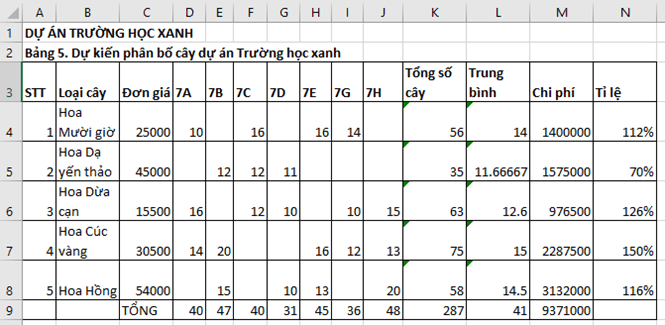 Vận dụng 9.5 trang 47 vở thực hành Tin lớp 7: Giả sử trước khi thực hiện dự án nhà trường giao chỉ tiêu trồng mỗi loại cây hoa là 50. Dựa trên bảng Dự kiến phân bổ cây dự án Trường học xanh em hãy tính tỉ lệ phần trăm của từng loại cây được phân bổ so với chỉ tiêu đã giao.