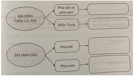 Câu 9 trang 51 vở thực hành Địa Lí 8: Hoàn thành sơ đồ về đặc điểm địa hình thềm lục địa và địa hình đảo của nước ta