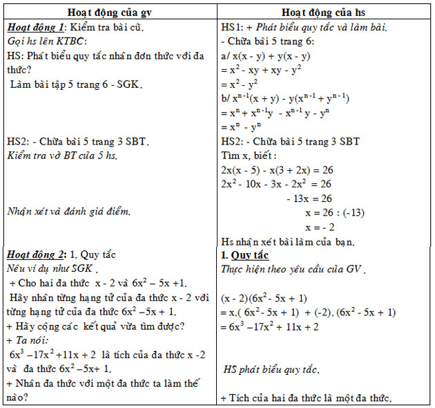Giáo án Đại số 8 chương 1 bài 2: Nhân đa thức với đa thức