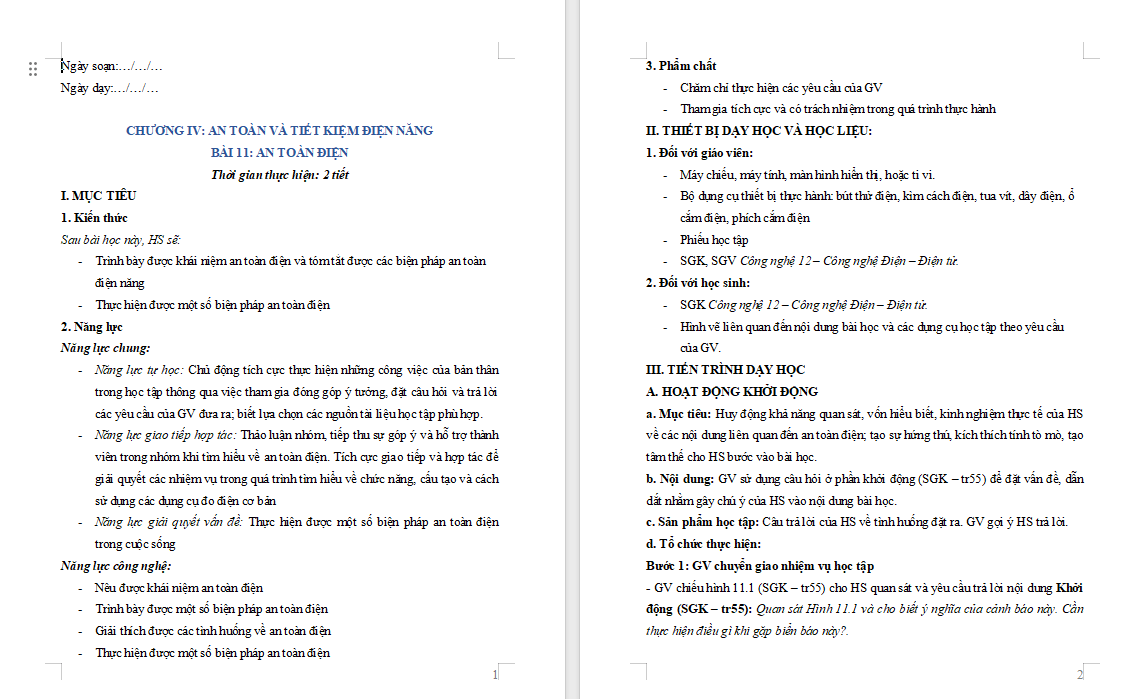 Giáo án Công nghệ 12 Bài 11: An toàn điện
