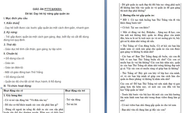 Ngoài File PowerPoint, giáo án dạy trẻ kỹ năng gấp quần áo còn có file Word có thể tải về và chỉnh sửa, mời các cô tham khảo.