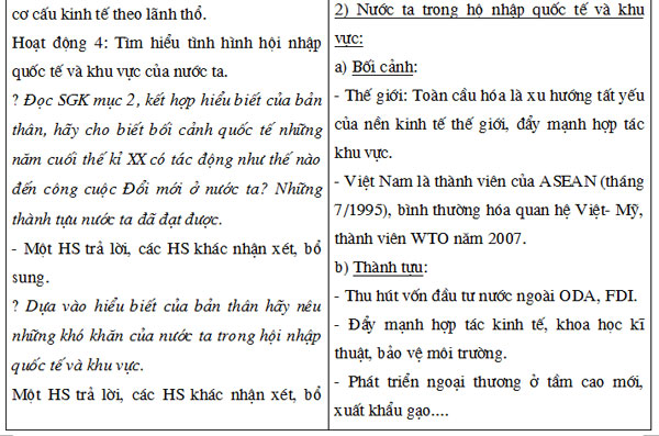 Giáo viên: sau hơn 20 năm tiến hành đổi mới, nền kinh tế nước ta đã đạt được những thành tựu nổi bật trên tất cả các lĩnh vực: kinh tế, chính trị, xã hội, an ninh quốc phòng. Tuy nhiên, vẫn còn rất nhiều thách thức, khó khăn mà chúng ta phải vượt qua để chủ động hội nhập trong thời gian tới.