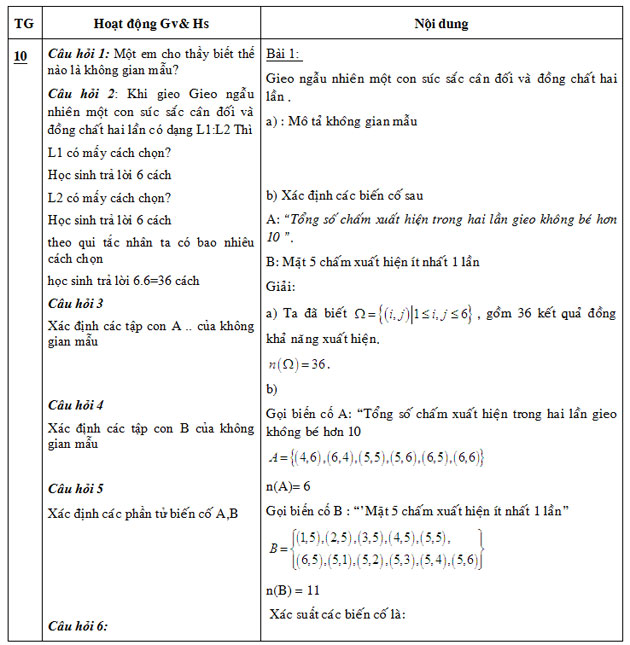 Việc biên soạn một giáo án hay không chỉ dựa vào kiến thức hay kinh nghiệm sẵn có của người giáo viên, mà bên cạnh đó, nó còn đòi hỏi mỗi người thầy giáo cô giáo phải không ngừng tìm tòi, nghiên cứu thêm nhiều phương pháp mới. Hiểu được điều đó, Thư viện VnDoc.com xin giới thiệu đến quý thầy cô giáo những bài giáo án môn Toán lớp 11 bài “Xác suất của biến cố phần bài tập”. Mời quý thầy cô cùng tham khảo để mang về cho mình những kĩ năng mới trong việc soạn giáo án, chúc các thầy cô có buổi lên lớp thành công.