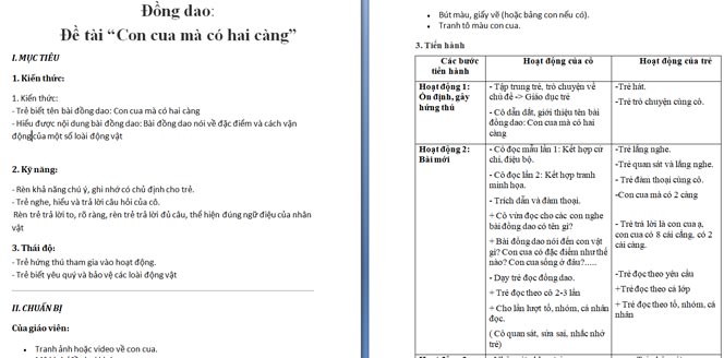 Ngoài File PowerPoint, giáo án đồng dao “Con cua mà có hai càng” còn có file Word có thể tải về và chỉnh sửa, mời các cô tham khảo.