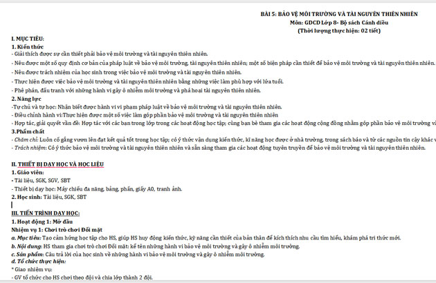 Ngoài File PowerPoint, giáo án GDCD 8 Cánh Diều bài 5: “Bảo vệ môi trường và tài nguyên thiên nhiên” còn có file Word có thể tải về và chỉnh sửa, mời các cô tham khảo.