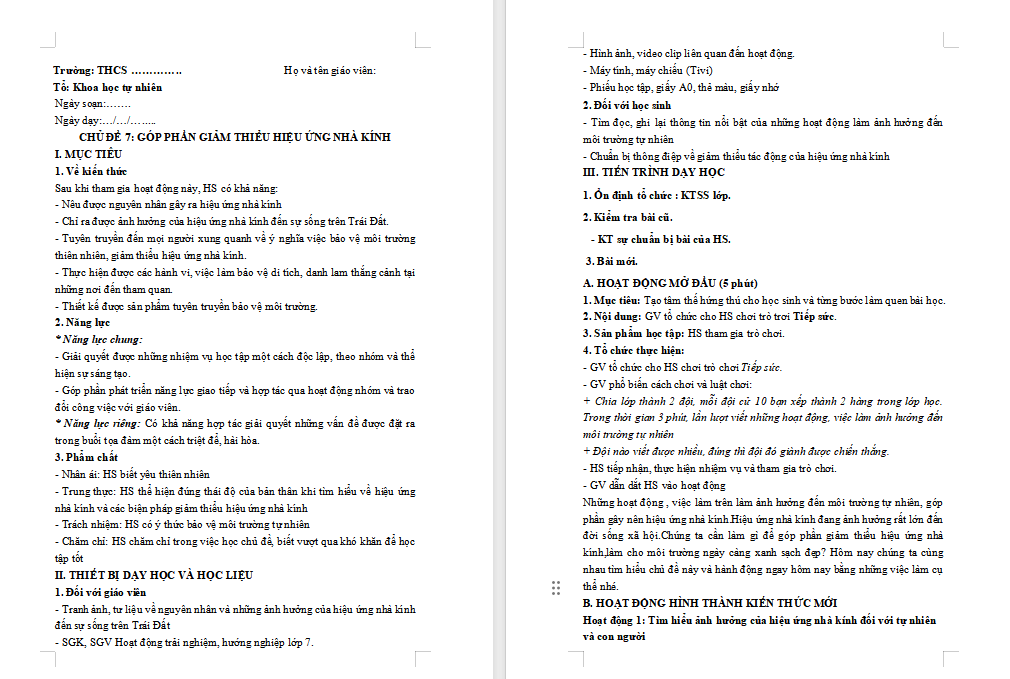 Giáo án Hoạt động trải nghiệm 7 Chủ đề 7: Góp phần giảm thiểu hiệu ứng nhà kính là tài liệu rất hữu ích được biên soạn cả dạng Word + PPT. Qua đó giúp quý thầy cô tiết kiệm thời gian làm bài giảng điện tử cho riêng mình.