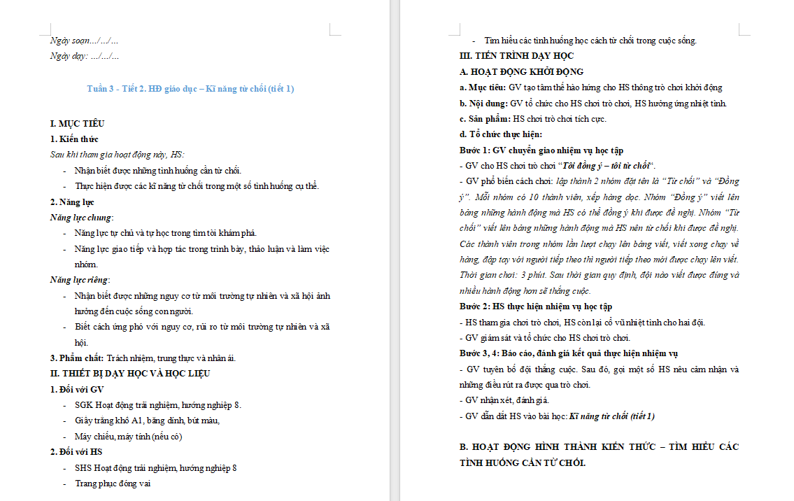 Giáo án Hoạt động trải nghiệm 8 Bài 2: Kĩ năng từ chối