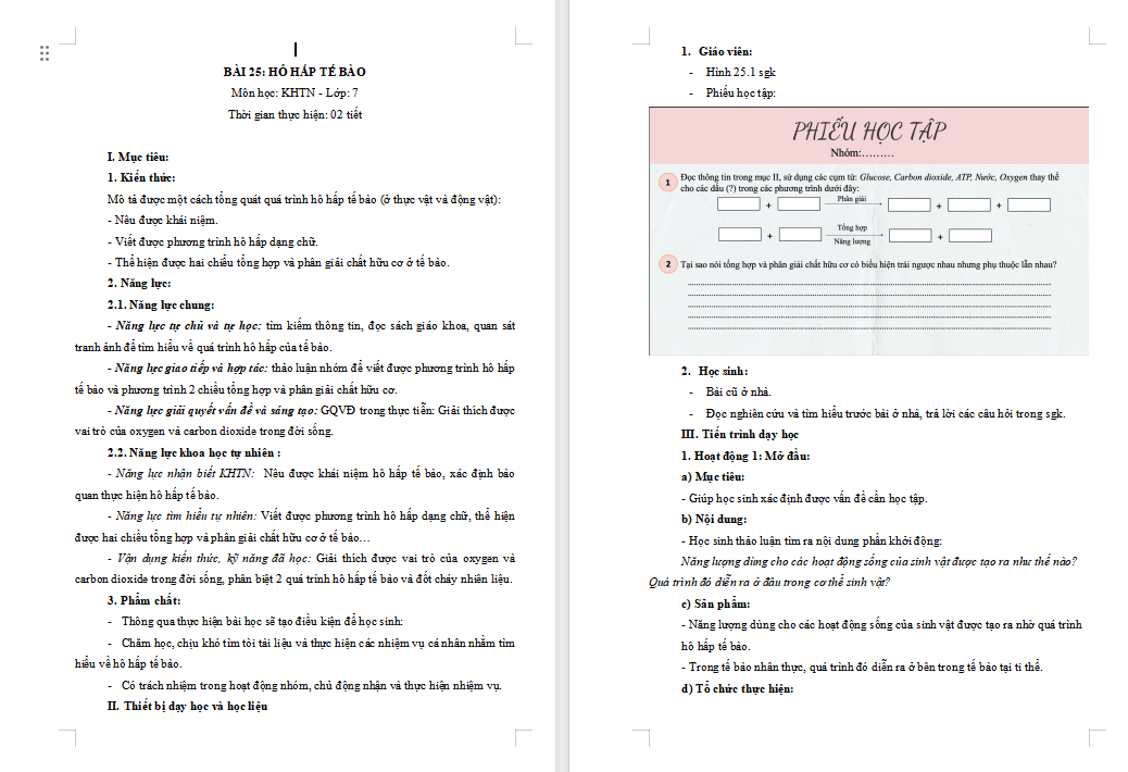 Giáo án Khoa học tự nhiên 7 Bài 25: Hô hấp tế bào thuộc phân môn Sinh học là tài liệu rất hữu ích được biên soạn cả dạng Word + PPT. Qua đó giúp quý thầy cô tiết kiệm thời gian làm bài giảng điện tử cho riêng mình.