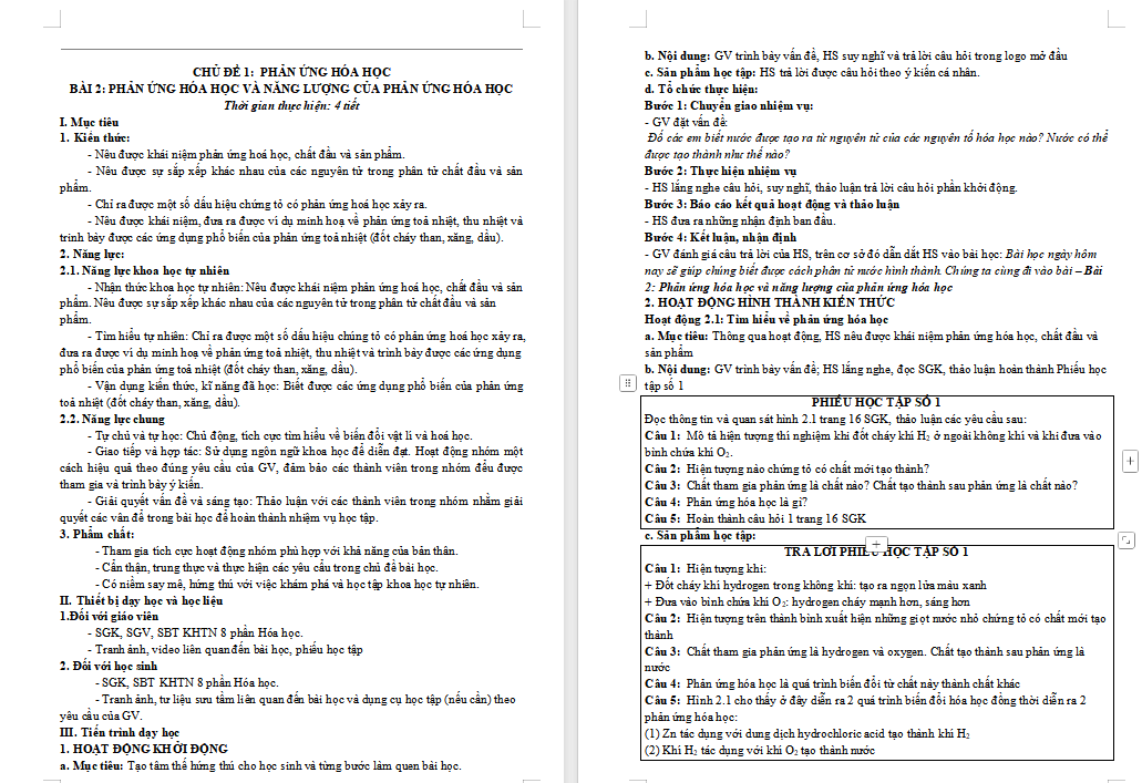 Giáo án KHTN 8 Phản ứng hóa học và năng lượng của phản ứng hóa học