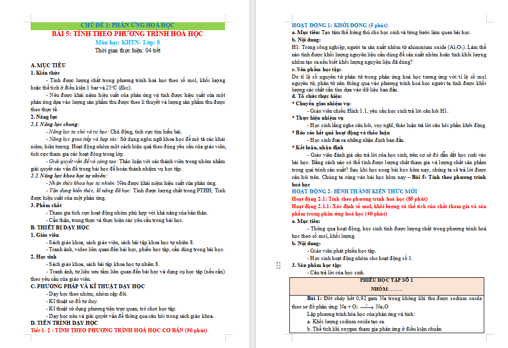 Giáo án Khoa học tự nhiên 8 Bài 5: Tính theo phương trình hóa học thuộc phân môn Hóa học là tài liệu rất hữu ích được biên soạn cả dạng Word + PPT. Qua đó giúp quý thầy cô tiết kiệm thời gian làm bài giảng điện tử cho riêng mình.