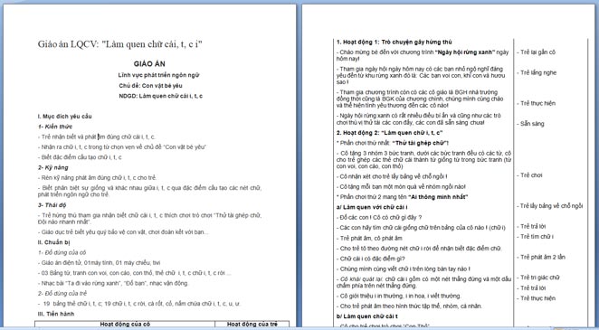 Ngoài File PowerPoint, giáo án làm quen chữ cái t, c, i còn có file Word có thể tải về và chỉnh sửa, mời các cô tham khảo.