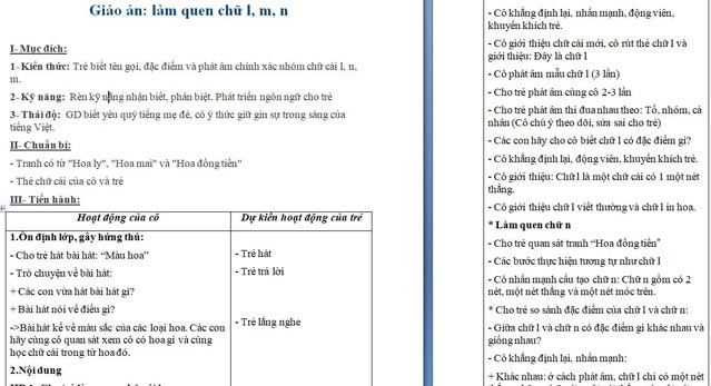 Ngoài File PowerPoint, giáo án làm quen chữ cái L, M, N còn có file Word có thể tải về và chỉnh sửa, mời các cô tham khảo.
