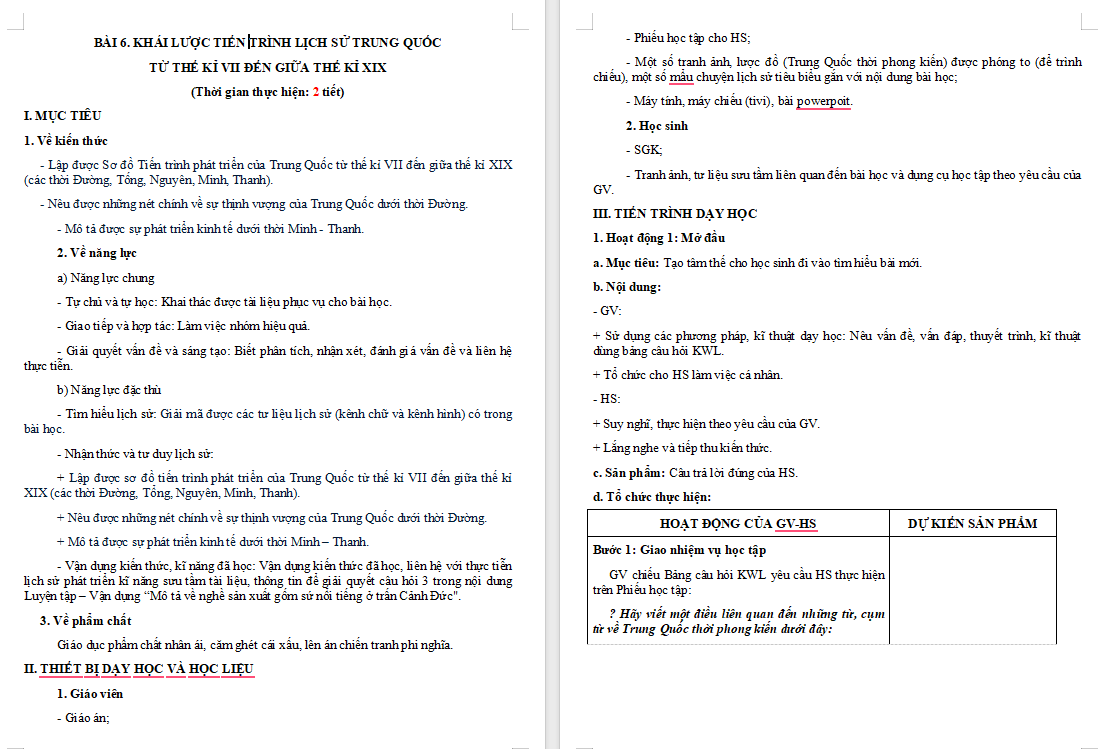 Giáo án Lịch sử 7 Bài 6 Khái lược tiến trình lịch sử Trung Quốc từ thế kỉ VII đến giữa thế kỉ XIX trình bày dưới dạng PowerPoint, Word tích hợp video Ai chèn vào PowerPoint dễ dàng chỉnh sửa. Qua đó giúp quý thầy cô tiết kiệm thời gian làm bài giảng điện tử cho riêng mình. Từ đó giúp giờ học trở nên trực quan, hấp dẫn, nâng cao hiệu quả tiếp thu và phát triển năng lực học môn Lịch sử. Vậy sau đây là nội dung chi tiết giáo án Lịch sử 7 Chân trời sáng tạo Bài 6 mời các bạn tải tại đây.