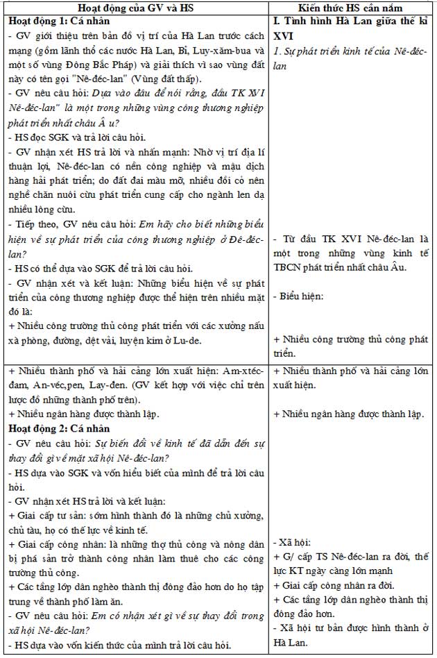 - Hiểu rằng, cuộc đấu tranh của nhân dân Hà Lan lật đổ vương triều Tây Ban Nha từ giữa thế kỉ XVI là một cuộc cách mạng tư sản đầu tiên của thời kì lịch sử cận đại thế giới.