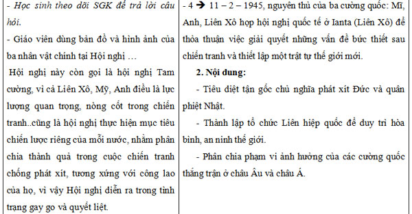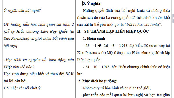 3. Bài mới: GV nhắc khái quát về giai đoạn cuối của chiến tranh thế giới thứ hai, ảnh hưởng của các cường quốc chi phối chính của cuộc chiến đến trật tự thế giới mới sau chiến tranh.