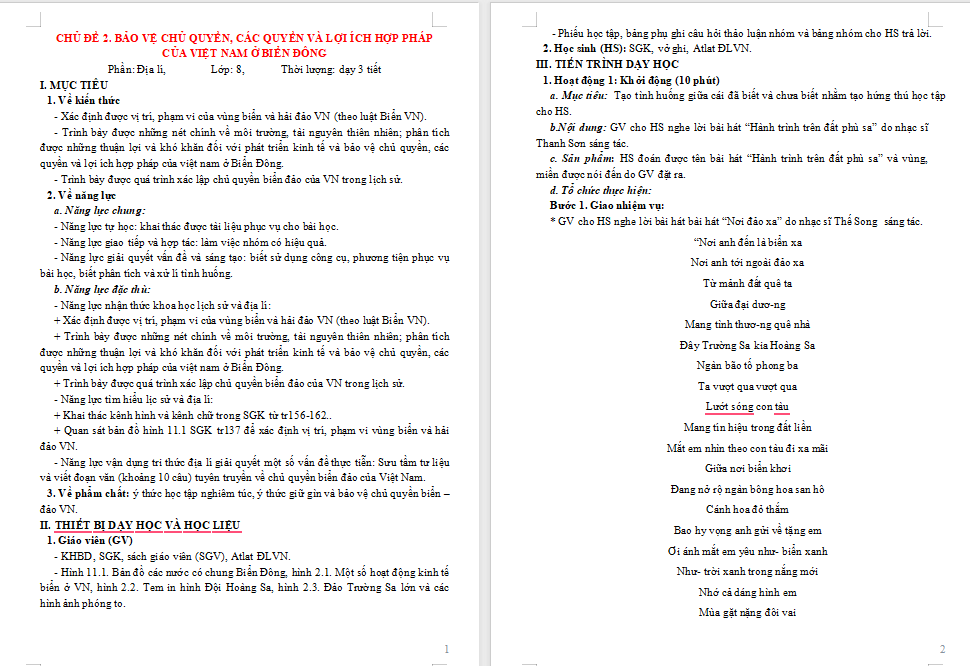 Giáo án Lịch sử và Địa lí 8 Chủ đề 2: Bảo vệ chủ quyền các quyền và lợi ích hợp pháp của Việt Nam ở Biển Đông