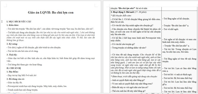 Ngoài File PowerPoint, giáo án truyện “Ba chú lợn con” còn có file Word có thể tải về và chỉnh sửa, mời các cô tham khảo.