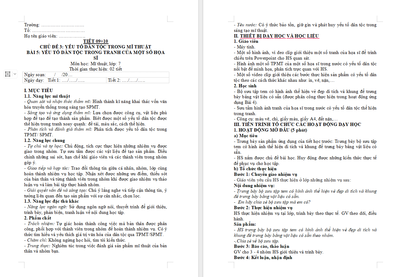 Giáo án Mĩ thuật 7 Bài 5: Yếu tố dân tộc trong tranh của một số họa sĩ được biên soạn rất chi tiết đầy đủ cả dạng Word + PPT. Qua đó giúp quý thầy cô tiết kiệm thời gian làm bài giảng điện tử cho riêng mình.