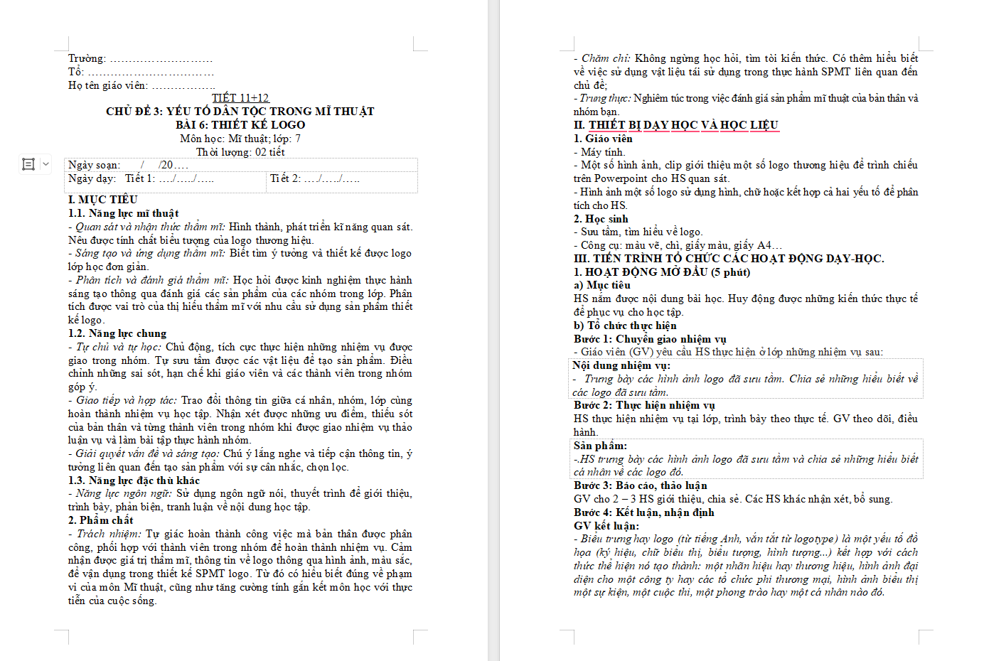 Giáo án Mĩ thuật 7 Bài 6: Thiết kế logo được biên soạn rất chi tiết đầy đủ cả dạng Word + PPT. Qua đó giúp quý thầy cô tiết kiệm thời gian làm bài giảng điện tử cho riêng mình.
