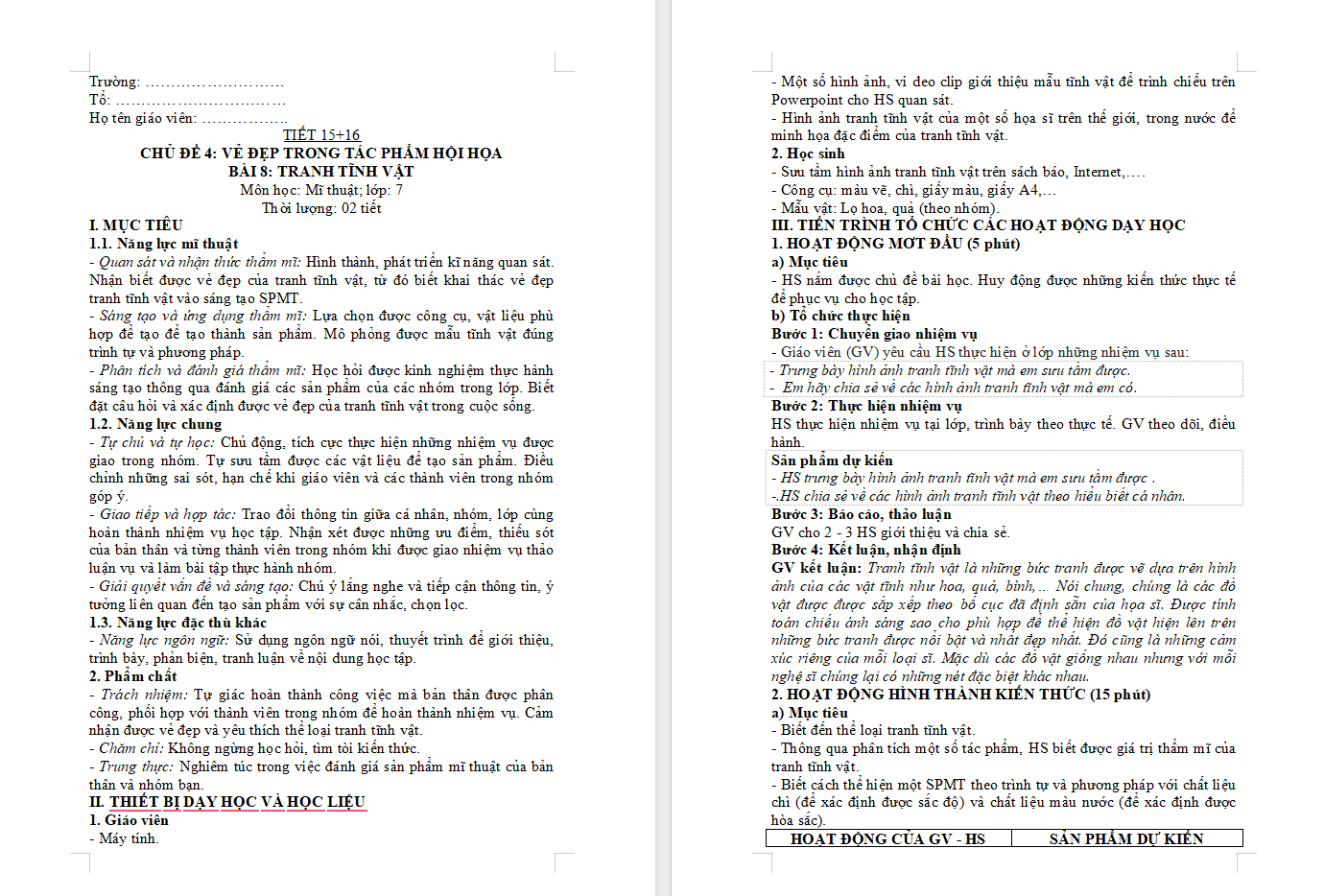 Giáo án Mĩ thuật 7 Bài 8: Tranh tĩnh vật được biên soạn rất chi tiết đầy đủ cả dạng Word + PPT. Qua đó giúp quý thầy cô tiết kiệm thời gian làm bài giảng điện tử cho riêng mình.