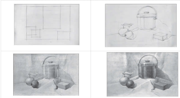 + Nhận xét về tỉ lệ, độ đậm, nhạt của các vật mẫu trong mỗi bức vẽ.