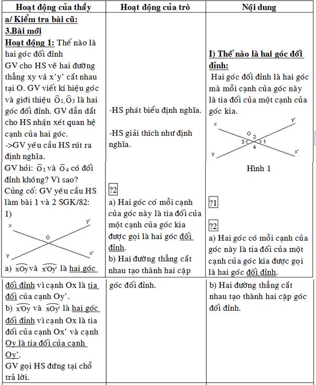 Giáo án môn Toán Hình học lớp 7 chương 1 với nội dung được biên soạn kỹ lưỡng bởi đội ngũ giáo viên có nhiều năm kinh nghiệm giảng dạy nhằm cung cấp cho các thầy cô tài liệu tham khảo hữu ích trong quá trình xây dựng bài giảng cũng như giúp học sinh hiểu hơn về môn hình học toán 7.