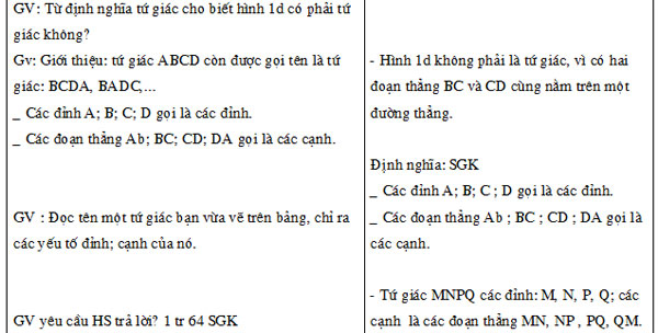 - Học sinh biết vẽ, biết gọi tên các yếu tố, biết tính số đo các góc của tứ giác lồi.