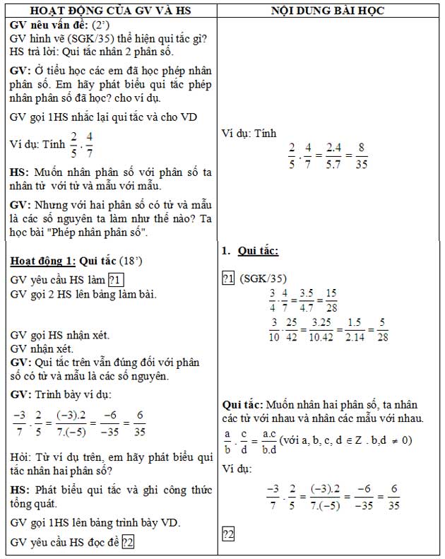 Giáo án môn Toán lớp 6 bài Phép nhân phân số