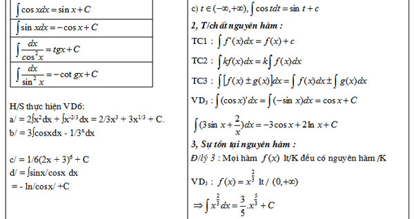 Nhấn mạnh bảng nguyên hàm và tính chất.