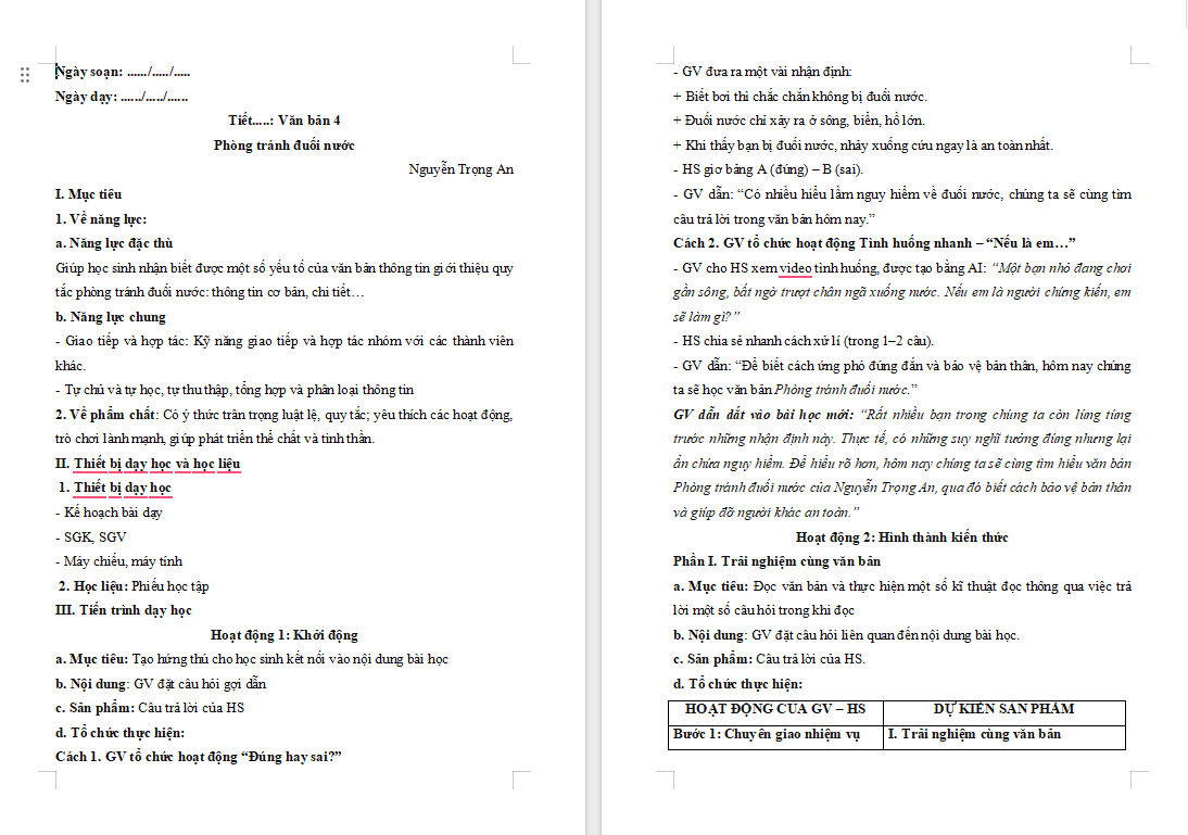 Giáo án Ngữ văn 7 Bài 5 Phòng tránh đuối nước