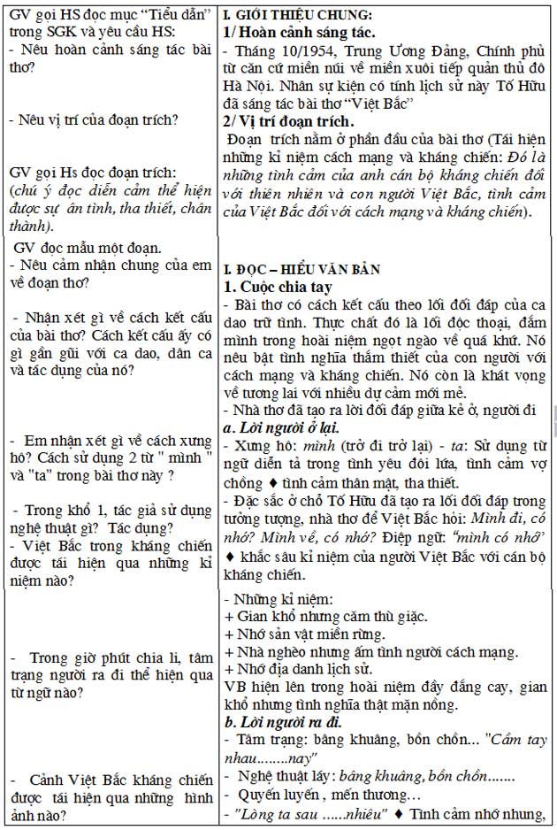 Thư viện giáo án VnDoc.com xin gửi đến quý độc giả giáo án ngữ văn bài “Việt Bắc” của nhà thơ Tố Hữu trong chương trình Ngữ văn lớp 12. Giáo án bài Việt Bắc sẽ giúp học sinh lớp 12 nắm được cuộc đời hoạt động cách mạng, sự nghiệp thơ ca, cũng như nét đặc sắc, nổi bật trong thơ Tố Hữu, mời các bạn cùng tham khảo.