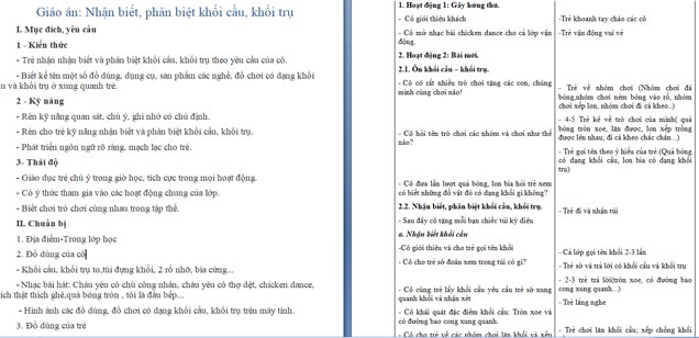 Ngoài File PowerPoint, giáo án nhận biết, phân biệt khối cầu, khối trụ còn có file Word có thể tải về và chỉnh sửa, mời các cô tham khảo.