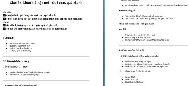 Ngoài File PowerPoint, giáo án nhận biết quả cam, quả chanh còn có file Word có thể tải về và chỉnh sửa, mời các cô tham khảo.